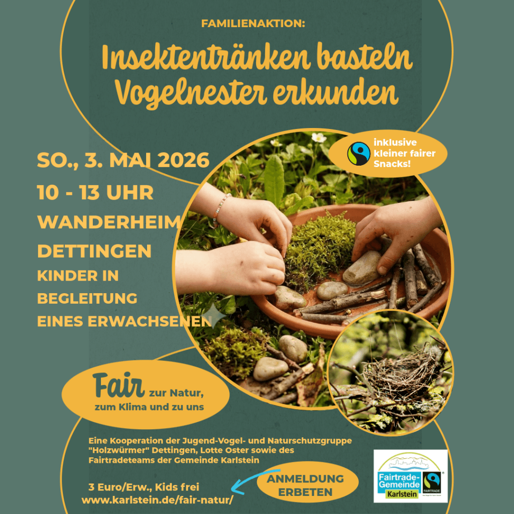 Die Kinder- und Jugendgruppe der Vogel-Naturschutzgruppe “Holzwürmer” wird uns an diesem Tag unterstützen – ebenso wie das Fairtradeteam der Gemeinde Karlstein, das zu einem kleinen fairen Snack und Getränken an diesem Vormittag einlädt.