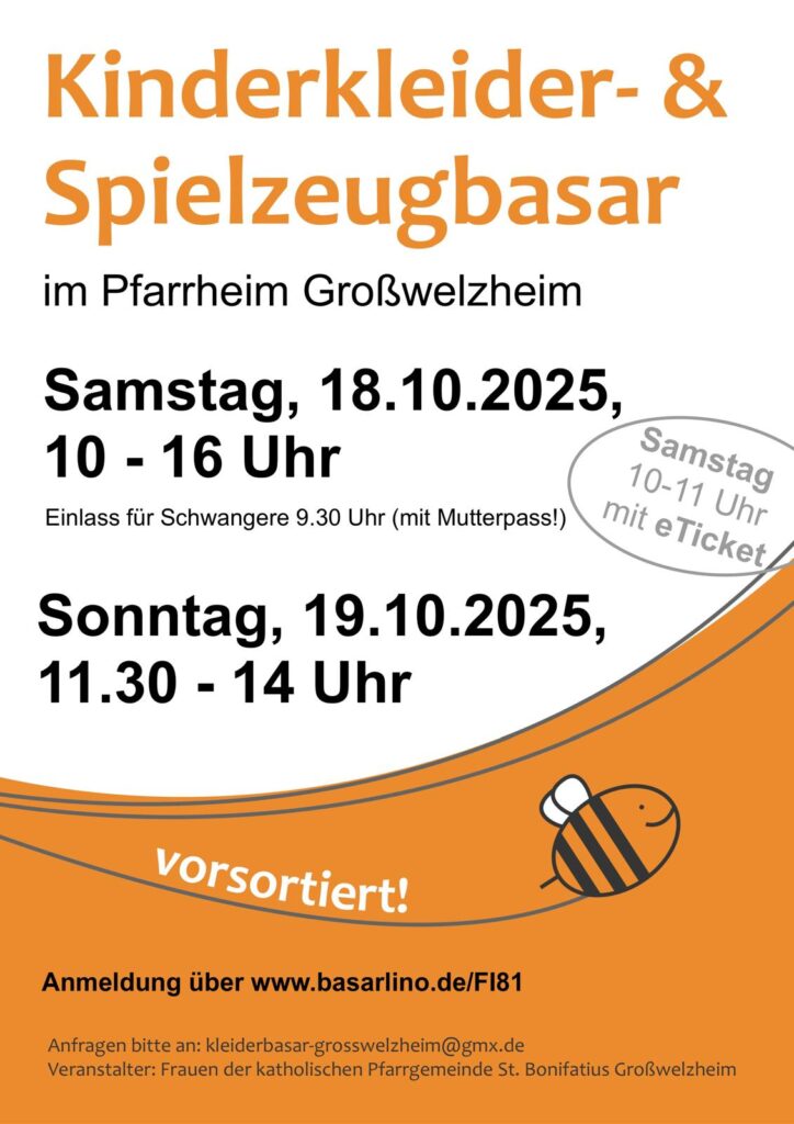 Unser vorsortierter Kinderkleider- und Spielzeugbasar findet am 17.10.25 von 10-16 Uhr statt (Einlass Schwangere 9.30 Uhr). Für den Zeitraum von 10-11 Uhr muss ein eTicket unter https://ticket.basarlino.de/FI81 erworben werden. Am 18.10.25 öffnet er von 11.30-14 Uhr. Angeboten werden Kleidung von Gr. 50-176, Schuhe, Spielsachen und Babyartikel wie Autositze, Kinderwagen, Spieltrapeze und vieles mehr.