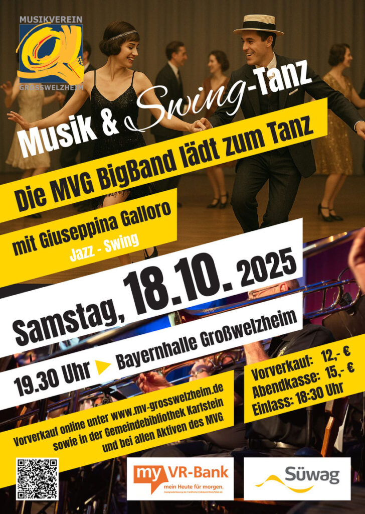 Der Gast ist in diesem Jahr ist Giuseppina Galloro. Die renommierte Show-Tänzerin aus dem Rhein-Main-Gebiet begeistert auch überregional mit energiegeladenen Performances. Ihre Leidenschaft gilt dem Swing und verwandten Tanzstilen, die sie mit beeindruckender Bühnenpräsenz zum Leben erweckt. Mit ihrem weitläufigen Netzwerk aus Tanzpaaren und Musikern hat sie bereits sehr erfolgreich ähnliche Veranstaltungen angeleitet (kürzlich im ZDF-Fernsehgarten). Mit professionellen “Tanz-Tastern“ bietet Galloro eine mitreißende Performance für alle an, die in dieser (Tanz-)Richtung noch keine Erfahrungen haben. Das sieht in der Praxis so aus: Nach einem Eröffnungsstück der MVG BigBand startet die kurze Einführung zum Abend. In den Pausen und zwischen den Musikblöcken werden den interessierten Tanzpaaren aus dem Publikum jeweils die wichtigsten Schritte mit kurzen „Tastern“ erklärt. Somit können auch weniger versierte TänzerInnen erste Swing-Erfahrungen sammeln. Um die Bühne herum gibt es ausreichend Platz zum Tanzen. Die Tanzschule also eingepackt und einen „be-swingten“ Abend erleben lautet die Devise des Musikvereins und der BigBand-MusikerInnen für diesen Abend!