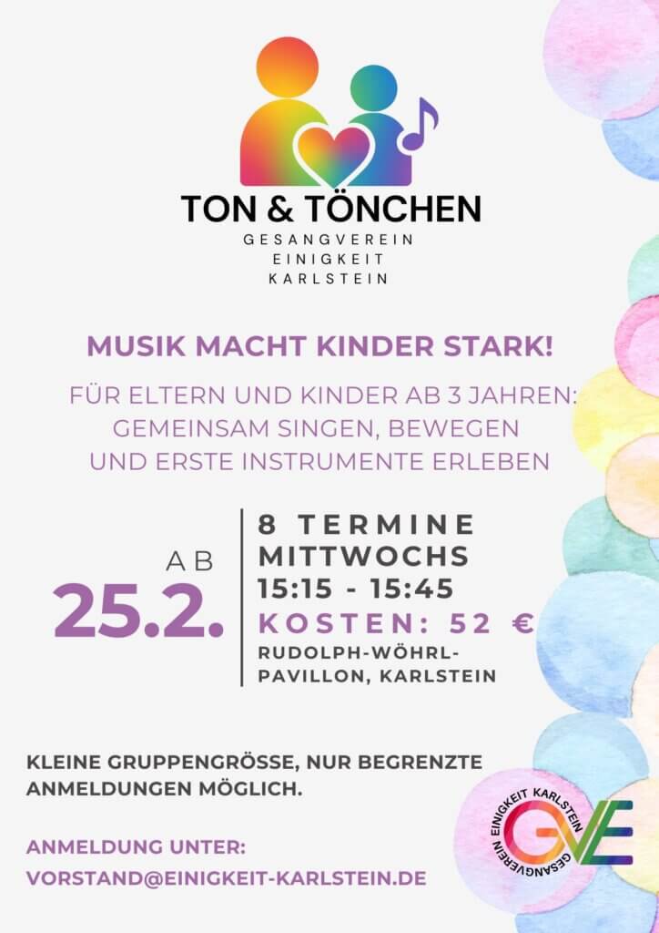 Im Mittelpunkt steht dabei immer der Spaß an Musik – ohne Leistungsdruck, aber mit viel Herz und Gemeinschaft. Für Eltern und Kinder ab 3 Jahren 8 Termine – immer mittwochs, 15:15–15:45 Uhr Start: 25.02.2026 Ort: Rudolph-Wöhrl-Pavillon, Karlstein Kosten: 52 € Jetzt anmelden und Platz sichern! Die Gruppengröße ist begrenzt – eine frühzeitige Anmeldung lohnt sich unter: vorstand@einigkeit-karlstein.de