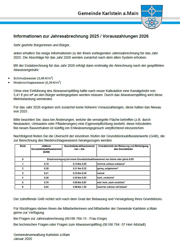 Mit der Endabrechnung für das Jahr 2026 erfolgt dann erstmalig die Abrechnung nach der gesplitteten Abwassergebühr:
